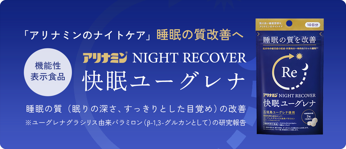 疲労回復に効果的な栄養素「ビタミン」に加えて、アミノ酸「グリシン」は、栄養不良に伴う寝付きの悪さ・眠りの浅さ・目覚めの悪さの改善に関与します。
