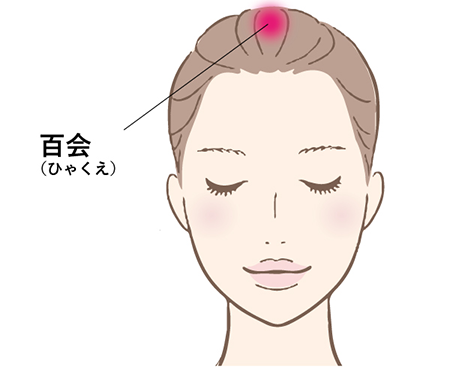 頭のてっぺんにあるツボで、左右の耳の上の先端と鼻を結んだ線の交点にあります。左右の中指を重ねるようにして当てて、手のひらで頭を包むように中指に圧を加えてください。