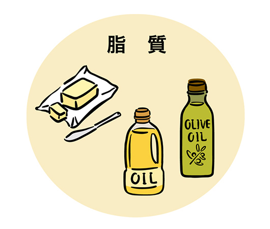 脂質はエネルギー源となるだけではなく、細胞膜の成分となったり、ホルモンの材料となったり、同じエネルギー産生栄養素である糖質やタンパク質とは異なる必須の役割ももっています。糖質・タンパク質・脂質の3つは、エネルギー源となることが共通の重要な役割ですが、それぞれに固有の働きがあり、どれかがどれかの代わりをすることはできません。主食・主菜・副菜を揃えた献立にすると、エネルギー産生栄養素のバランスが整いやすくなるのでおすすめです。