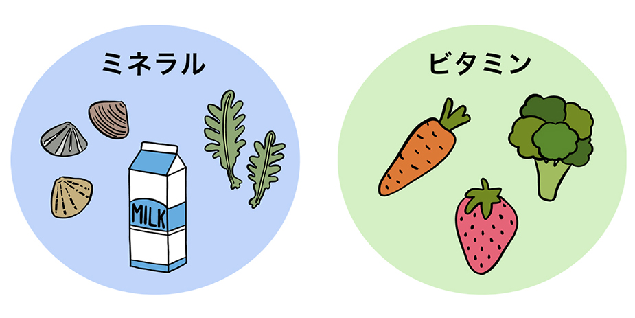 ただ、生命活動のためのエネルギーは三大栄養素のみでは作ることができません。体内における生命活動の多くが化学反応によって行われていて、その化学反応を円滑に進めるためには、ビタミンやミネラルが必要です。ビタミンやミネラルはエネルギーとしては使われず、必要量も三大栄養素に比べるとごくわずかですが、欠かすことはできません。