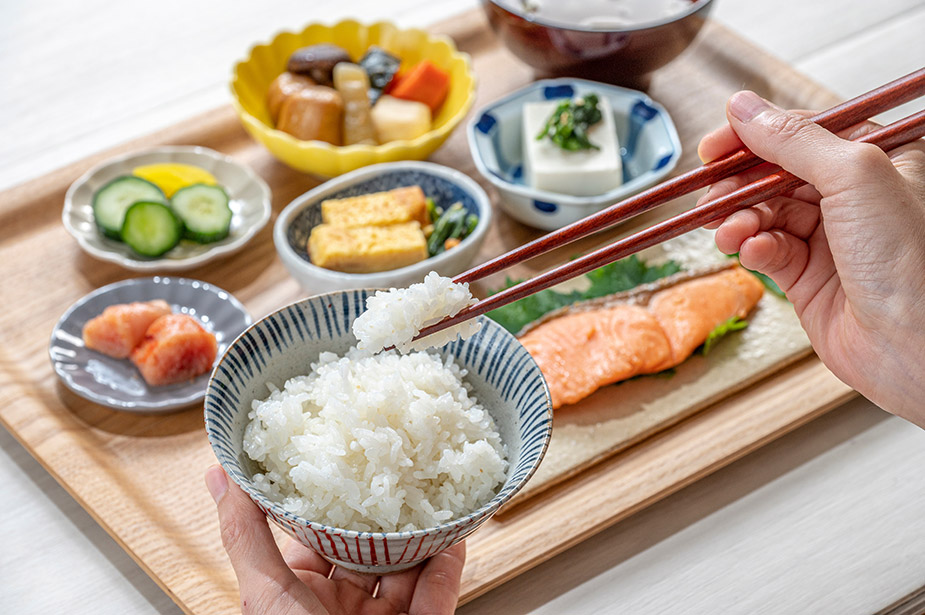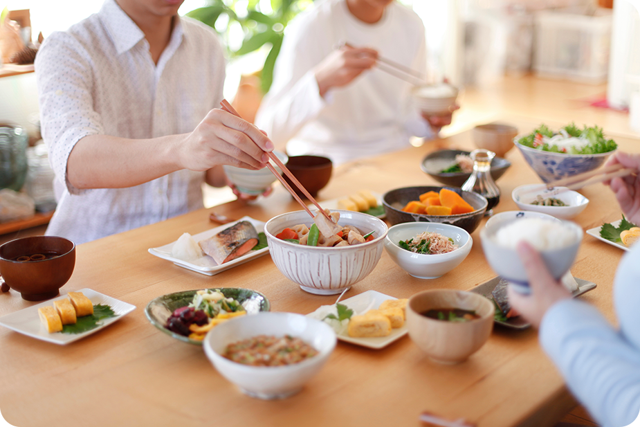 農林水産省と厚生労働省による「食事バランスガイド」では、食事を主食(ご飯、パン、麺)、主菜(肉、魚、卵、大豆料理)、副菜(野菜、きのこ、いも、海藻料理)、牛乳・乳製品、果物に分類して、それらを年齢や性別、身体活動量に応じて適量食べることで、バランスのよい栄養素の摂取が可能になるとされています。