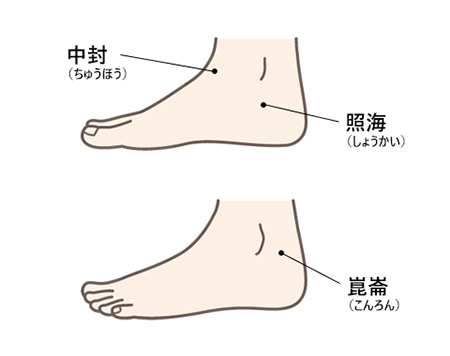 内くるぶしの真下にあるくぼみのあたり。照海は少陰腎経(しょういんじんけい)という経絡上のツボで、血行をよくし、慢性化した腰痛に効果的とされています。また腎経上のツボであるため頻尿など泌尿生殖器の障害に有効である他、血行改善作用により、女性に多い諸症状、または高血圧、不眠、不快感などにも効果的です。その他、アレルギー症状に対しても使われることのあるツボです。