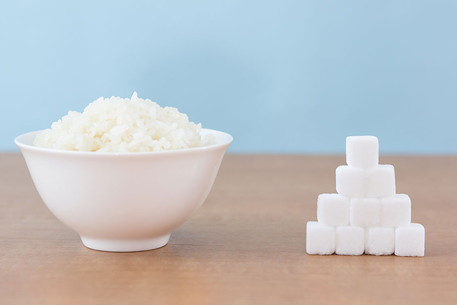 ブドウ糖は、ごはん、パン、麺類などの穀類、さつまいもやじゃがいもといったいも類など、炭水化物に多く含まれています。砂糖などの甘味料や、バナナ・リンゴなどの果物にも含まれていますが、甘いものを過剰摂取すると血糖値を急激に上げてしまうため、食べる量に気をつけてバランスよく摂取したいものです。