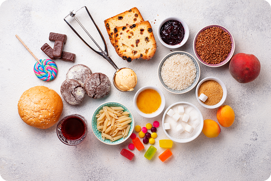 炭水化物の構成要素をみていくと、ブドウ糖は糖質中の、単糖類に分類されます。料理やお菓子などによく使用される砂糖(ショ糖)は二糖類で、ブドウ糖と果糖が結合したもの。少糖類は「オリゴ糖」とも呼ばれ、腸内の善玉菌を増やす効果があるため、健康に役立つことが期待できる「特定保健用食品」にも利用されています。また、多糖類の代表的なものとして挙げられるのは、でんぷんやグリコーゲン。どちらもブドウ糖が多数結合したもので、体のエネルギー源となります。