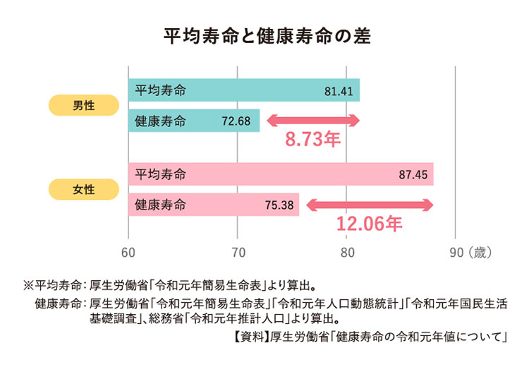 このことから、日本人は人生の最後の10年前後を「健康」とはいえない状態で過ごしている可能性があることがわかります。健康な状態で長生きするには健康寿命の延伸はもちろん、平均寿命との差の縮小が重要です。