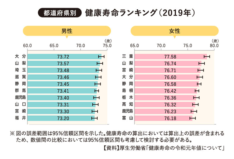 2019年に最下位だった都道府県の健康寿命は、男性は岩手県で71.39歳、女性は京都府で73.68歳でした。つまり地域によって、男性では最大2年以上、女性では4年近くの差があることがわかります。