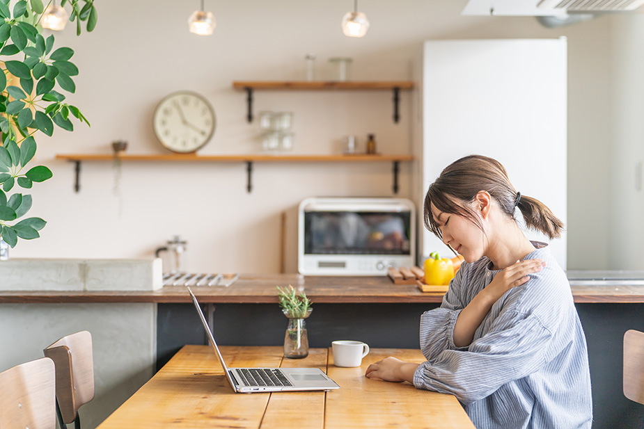 例えば長時間にわたるデスクワークやスマートフォンの操作は血行不良を引き起こしやすく、首や肩周辺の筋肉が硬くなり、こりや痛みを感じやすい状態になってしまいます。バンザイ寝の姿勢をとるのは、日常の姿勢や習慣による筋肉のこりだけでなく、体全体の代謝や血行不良などにより、回復が十分に行われなかったり、筋肉に十分な酸素や栄養が届かなくなることで、結果的に筋肉の張りやこりが起こりやすくなることも一因です。