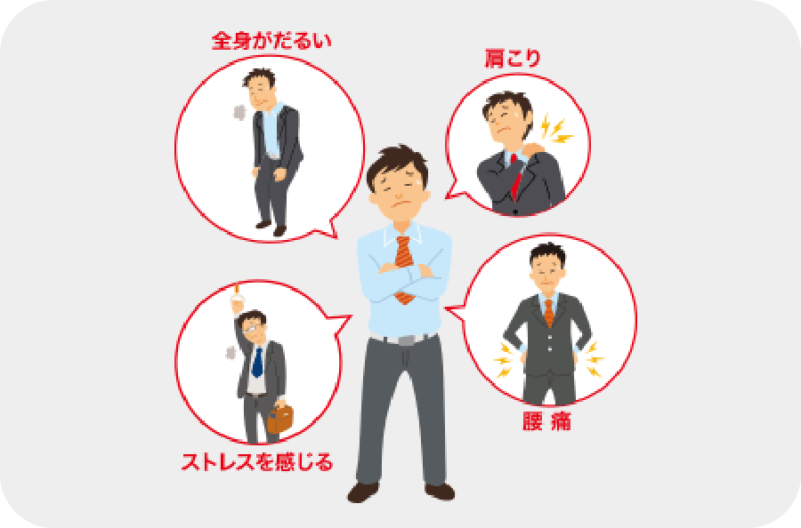 「非常に疲れている」人の多くに、体全体のだるさ、部分的なこりや痛み、さらに気持ちの疲れなど、複合的な症状が「ときどき疲れを感じる」人よりも多いことがわかりました。なかでも、半数が肩こり、腰痛をあげていて、倦怠感とストレスを感じるを、ともにあげている人も多く見られます。