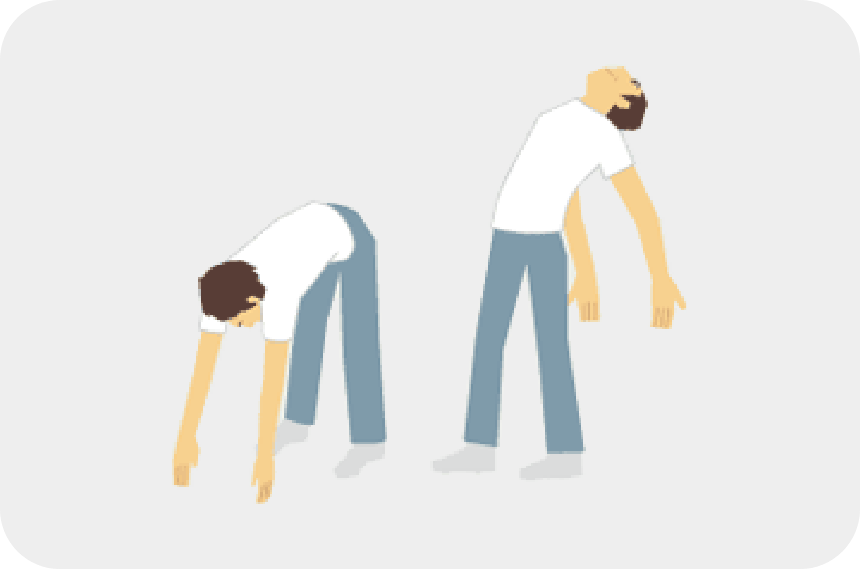 両足を肩幅より少し広く立ち、上体をゆっくり前に倒します。次いでゆっくり起こしていき、軽く腰を反らし、胸を張ります。
