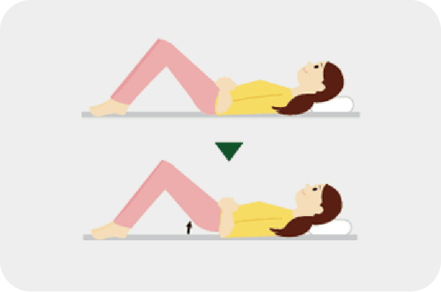 両膝を軽く立て、腰は床に着けたままお尻だけ少し持ち上げ、5~10秒間保ちます。