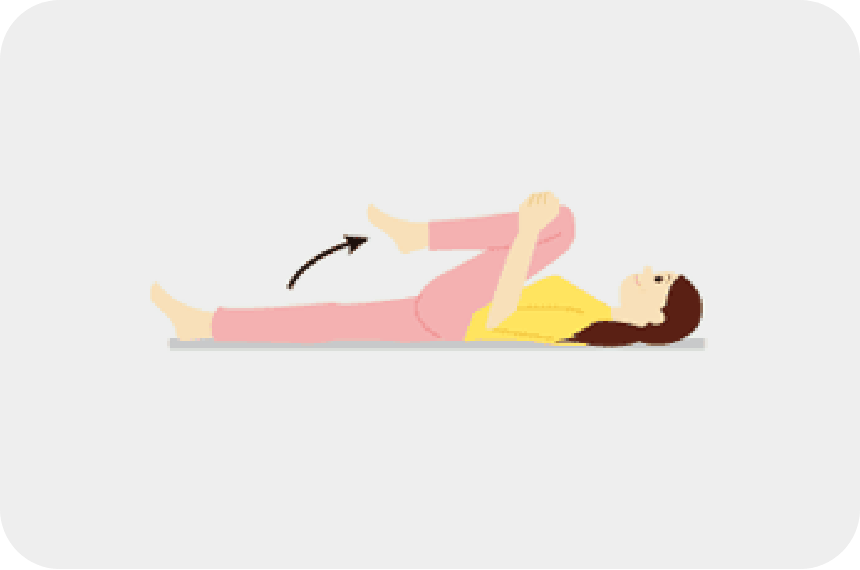 片方の膝を両手で抱え込んで胸に引き寄せ、もう一方の脚は床にぴったり着くようにしっかり伸ばします。