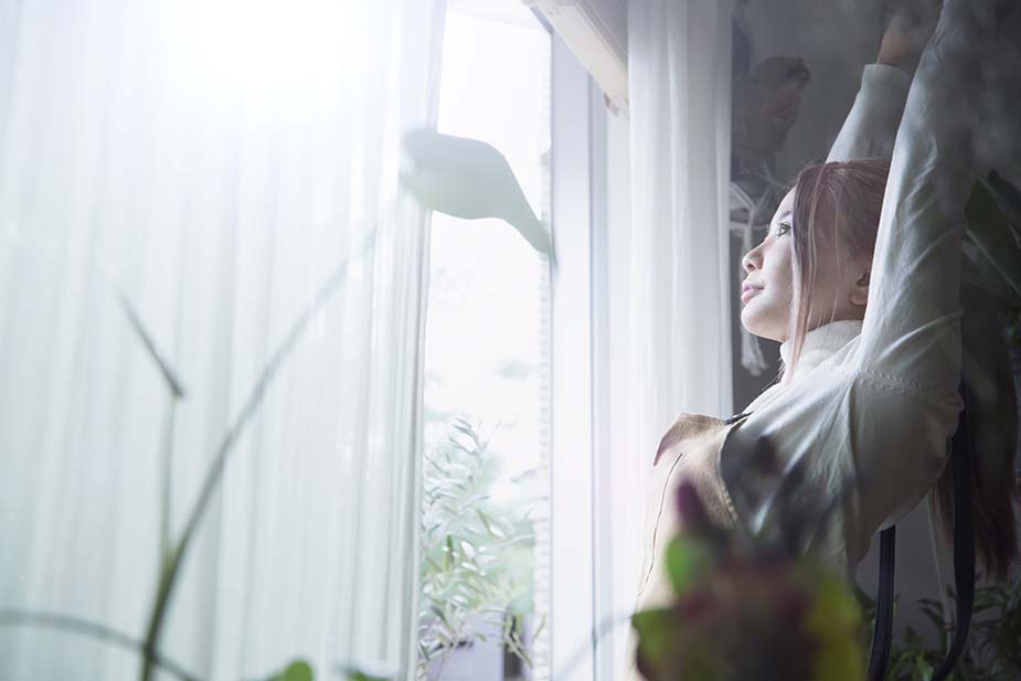 朝起きてからすぐ(午前中のなるべく早めの時間帯)に15分程度太陽光を浴びるようにしてみましょう。朝、起きて太陽光を最初に浴びた時刻に応じて、夜に眠気が出現し、自然に眠くなる時刻(起床から約14~16時間後)が決定されます。