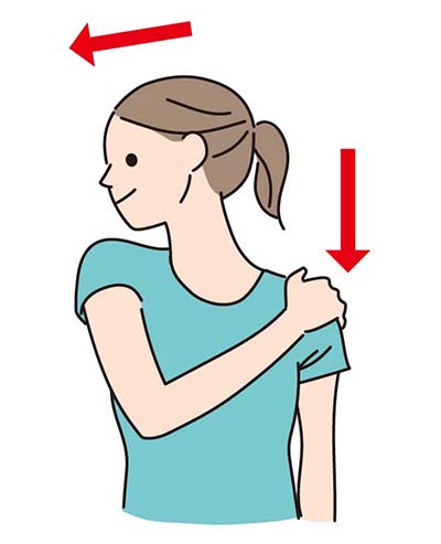 - ❶右手を左肩にのせ、肩を引き下げるように手で押さえます。