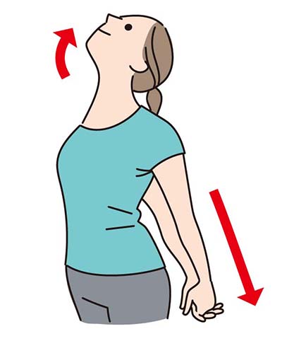 - ❶体の後ろで両手を組み、左右の肩甲骨を引き寄せます。