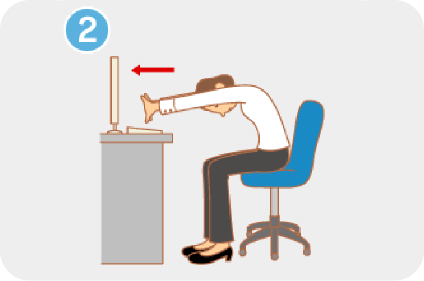 頭を下げ、あごを引いたまま、目を閉じながら、腕を大きく前へ伸ばし、首、肩、背中、腰にかけてストレッチします。![]()