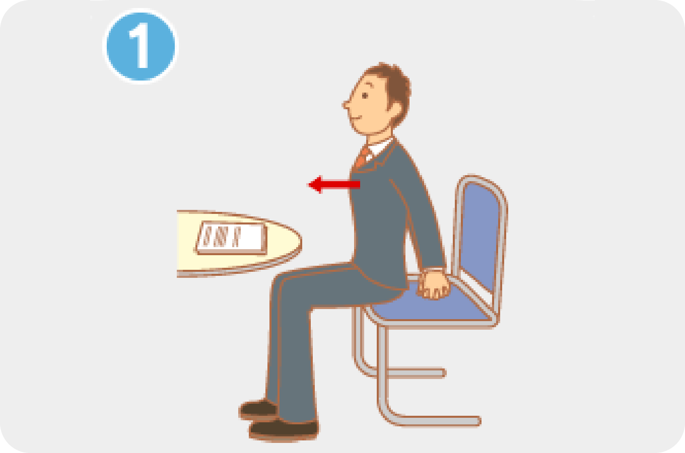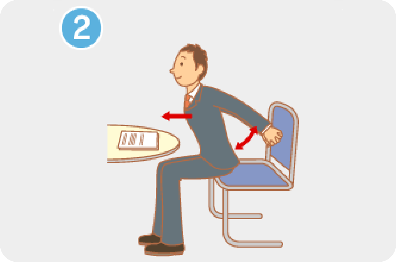 ❶椅子に浅く座り、背筋を伸ばし、お腹をへこませ、両手を後ろに回して、手のひらを合わせて指を組みます。肩甲骨をできるだけ真中へ寄せるようにしながら胸を張り、15秒間キープ。