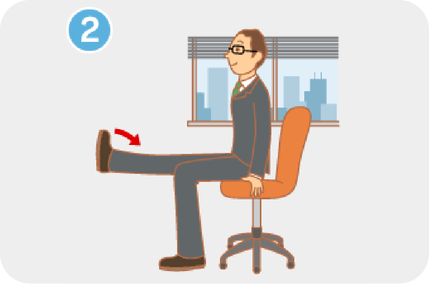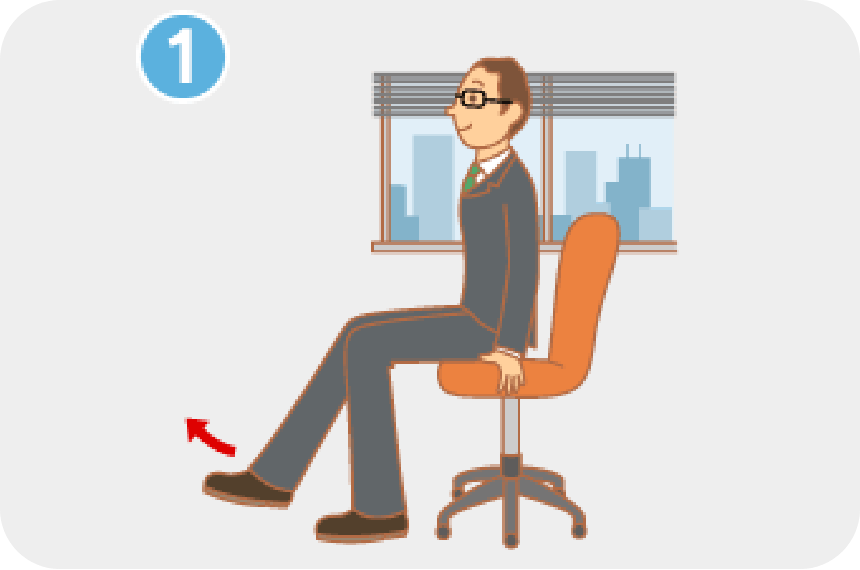 ❶椅子に浅く座り、背筋を伸ばします。同時に左足を前に伸ばし、かかとを床につけ、つま先をできるだけ立て、ひざ裏を中心にふくらはぎ、太ももの後ろをしっかり伸ばします。