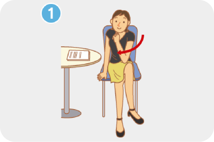 ❶椅子に浅く座り、あごを引きます。そのままの状態で、お腹にギュッと力を込めてへこませます。