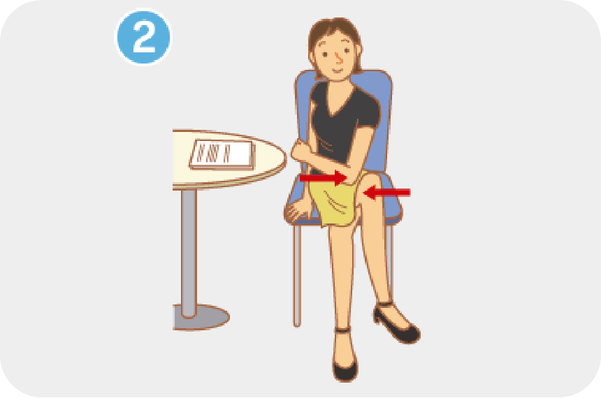 ❷①の状態から、左ひじを右ひざの外側に当て、ひじでひざを10秒強く押し合います。足を組みかえて反対側も同様に。