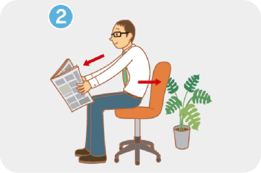 ❷①の状態から、背中を少し丸めて上体を後ろへゆっくり倒しましょう。そして、背もたれにつく寸前で10秒間そのままの状態をキープしてから、ゆっくりと元の姿勢に戻ります。