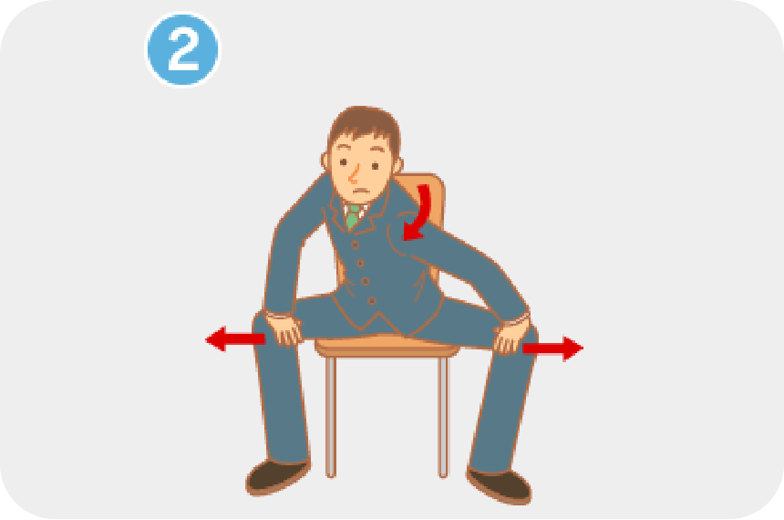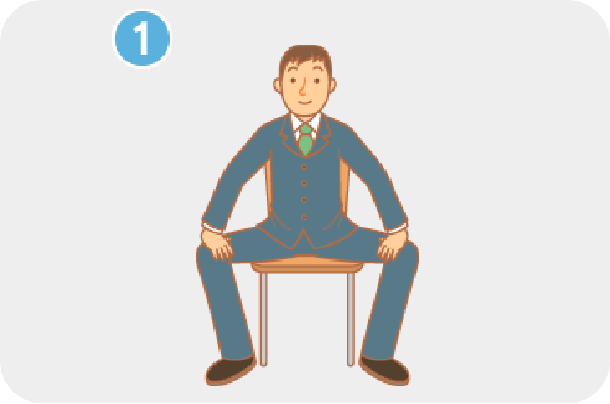 ❶椅子に座り、背すじを伸ばし、あごを引き、つま先を逆八の字にして両足を大きく開き、両手をひざの内側に当てます。