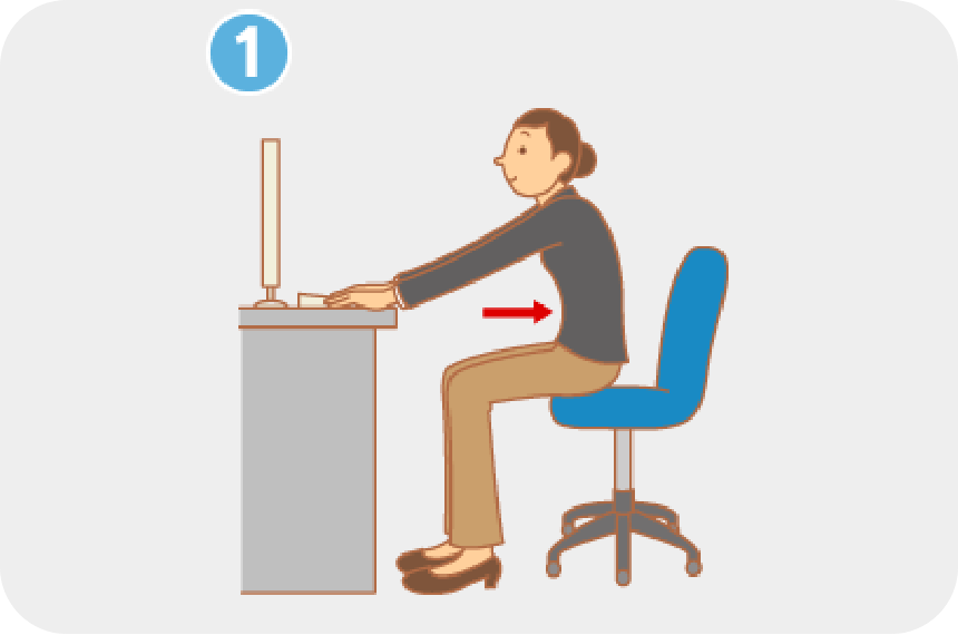 ❶椅子に浅く座り、椅子とデスクの間を少しあけ、デスクに両手を付けます。背中をやや丸めて、お腹に力を込めてへこませます。