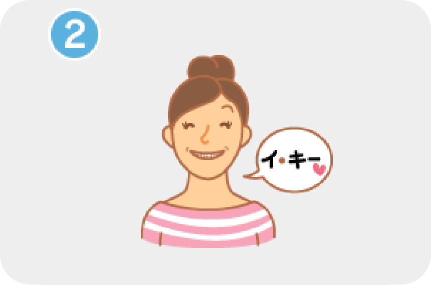 ❷「イ」と「キー」は口を思いきり横に開きながら目を細めます。「ウ・イ・ス・キー」の言葉を1セット5秒で5回繰り返します。5回目の最後の「キー」だけ10秒維持します。慣れるまでは洗面台などで鏡を見ながらやってみましょう。