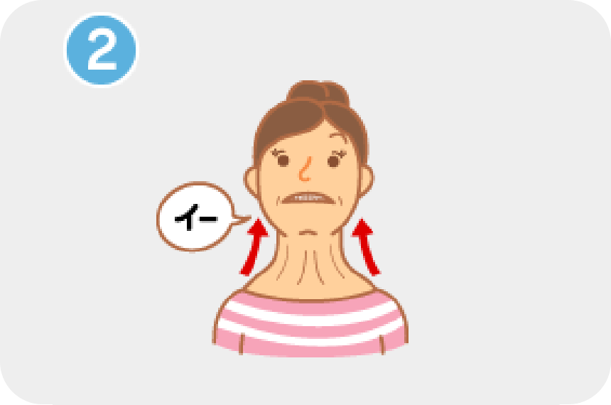 ❷「イー」と声を出しながら、口を横に開き、首筋を強く張ります。肩から首にかけて力を入れ、できるだけ大きく張るようにイメージしながら10回行います。