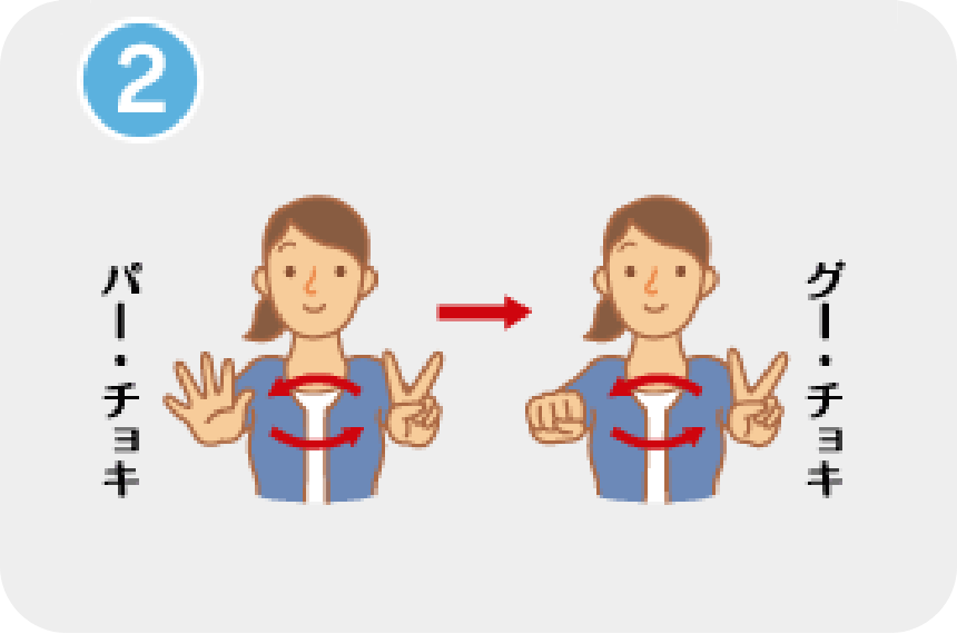 手指の複雑な動きは脳を活性化します。「グー」は力強く握り締め、「パー」は5本の指を大きく反らし、「チョキ」は指の間をできるだけ開いて行いましょう。