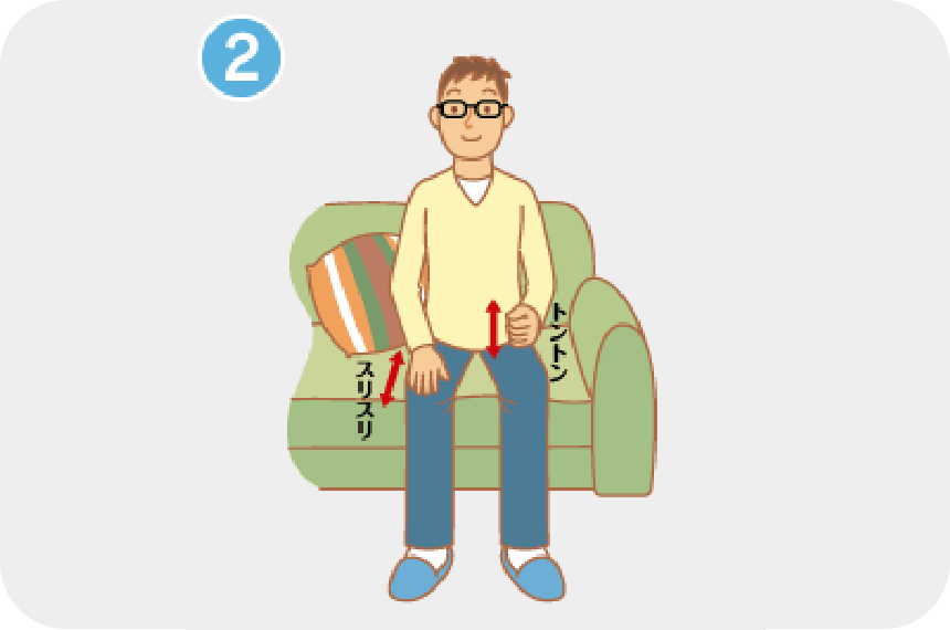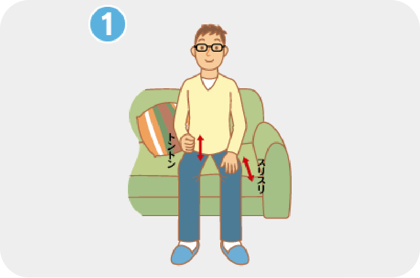 ❶椅子に座り、両手を太ももの上に。右手は太ももを上下にトントン叩き、左手は前後にスリスリさせます。