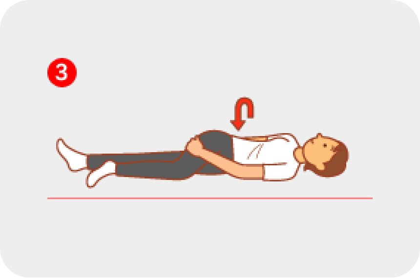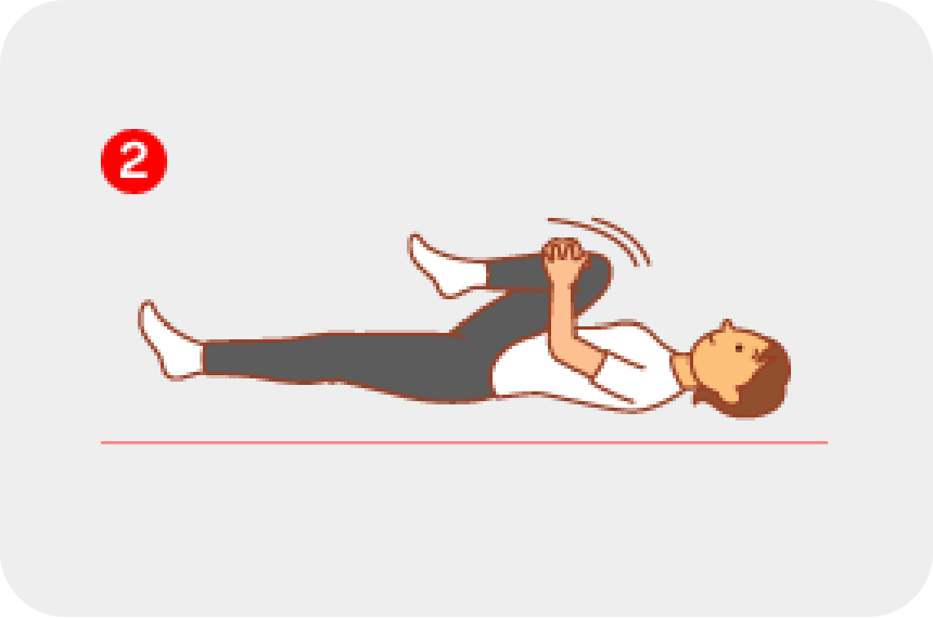 ❷片足をおなかに抱え込み、腰と足の筋肉を伸ばす。