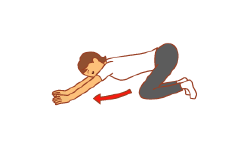 よつんばいになって腰の位置をキープし両手を少しずつ前へ。息を吐きながら、そのままのポーズを保つ。