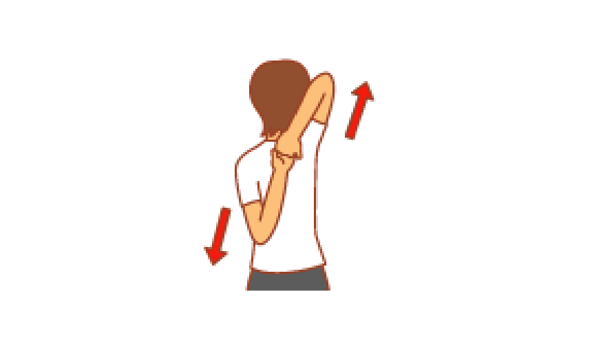図のような形で両手をつなぐ。息を吐きながら引っぱりあう。左右の手をかえて、もう一度トライ。