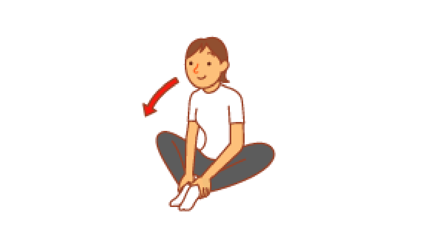 足の裏をあわせて座り両手で足首をつかむ。背筋をのばし、ひじでももの内側を押し、息を吐きながら前傾。