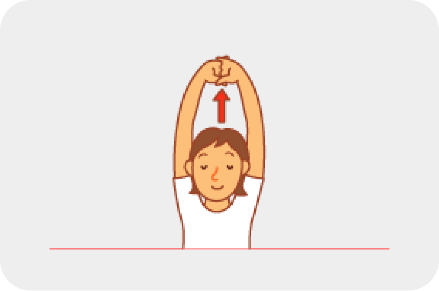 ❶両手をあわせて上へ押し上げるようにする。このとき、後ろのほうに押すようにするとより効果的。