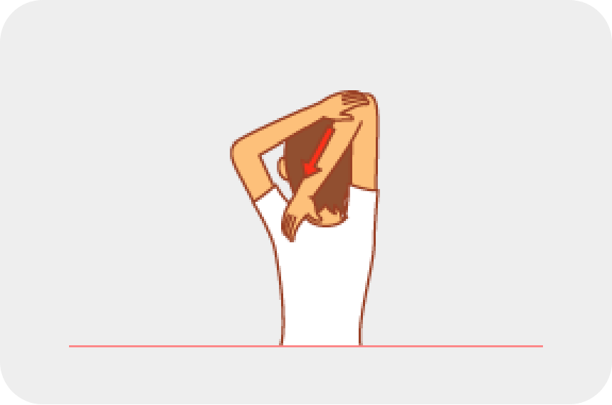 ❸頭の後ろで手を図のように組む。ひじの上に置いたほうの手を横に引っぱる。手を組みかえ反対もトライ。