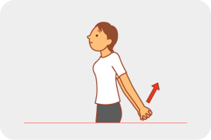❺両手を後ろに組み、ひじを曲げないようにして、そのまま上のほうにのばす。できるところでやめておく。