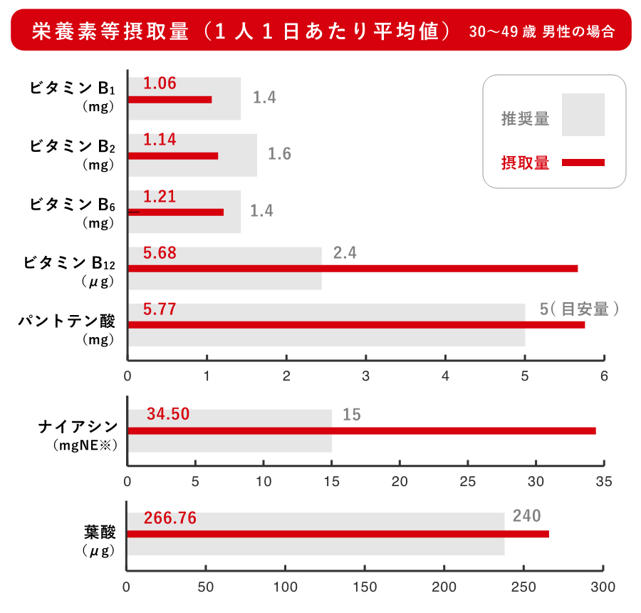 令和元年の国民健康・栄養調査によると主要なビタミン類のほとんどが推奨量を満たしていないことが分かります。特に、疲れと関係の深いビタミンB1は全ての世代で不足が明らかになっています。