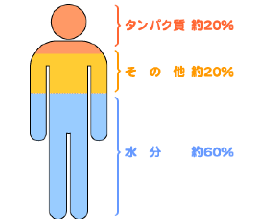 人の体は約60%が水で構成されており、残りの半分、つまり約20%はタンパク質から構成されています。体は、筋肉、皮膚、血液、臓器、神経そして骨など様々な組織からできており、タンパク質はそれぞれの組織に見合った構造であるとともに、いろいろな機能を発揮して体の働きを支えています。