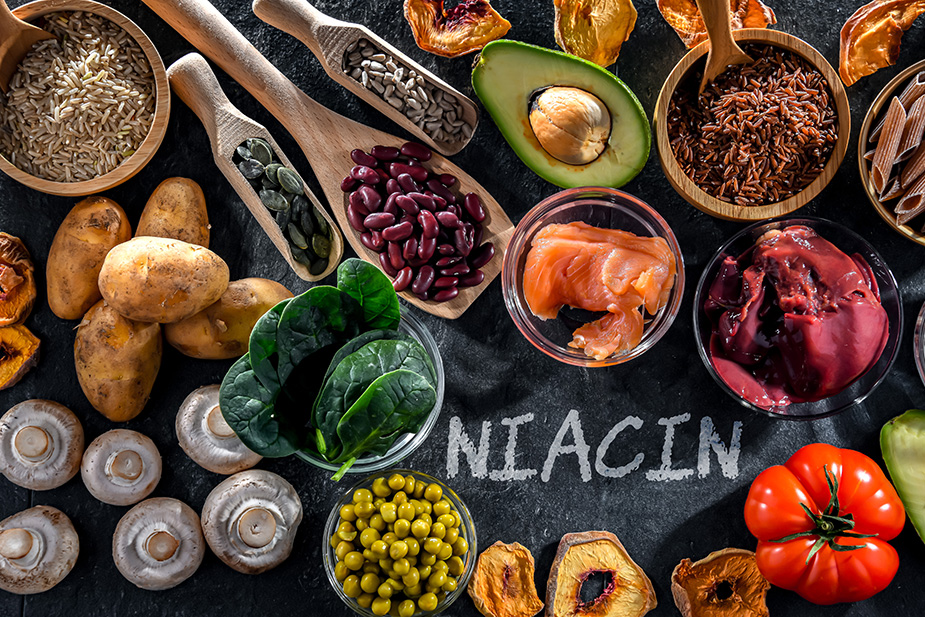 ビタミンB群の一種で、「ビタミンB3」とも呼ばれます。糖質や脂質、タンパク質の代謝に必要とされる他、皮膚の機能を保持する働きをもっています。また、アルコールを飲んだ後にできる「アセトアルデヒド」という、二日酔いの原因ともいわれる物質の分解にも関係しています。ナイアシンは、ニコチン酸とニコチンアミドの総称です。